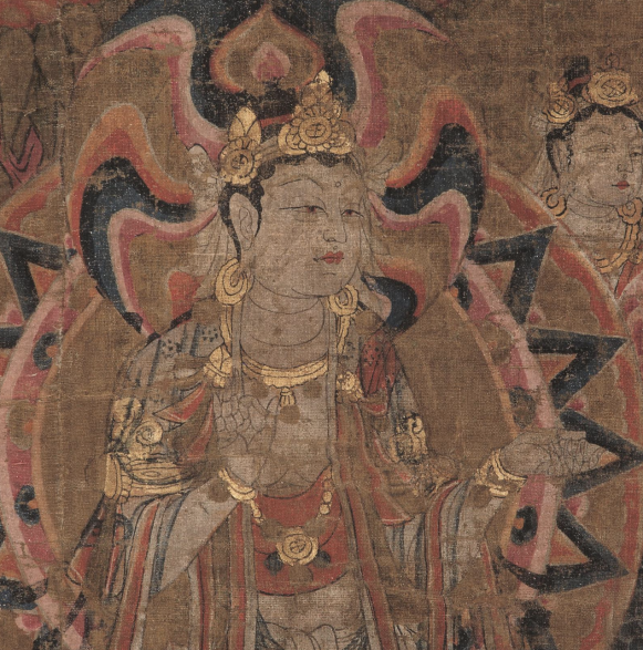 供养菩萨双手合十,侧身向里做胡跪状,两侧绘莲蕾四朵,左肩旁绘尖瓣莲蕾一只。人物形象、技法都具有印度、西域早期石窟和汉风相融合的特点。