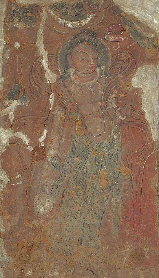 第四窟残存的北凉时期弥勒菩萨像相对比较完整,菩萨向左扭腰,上身裸露披飘带,下身着绿色长裙。壁画中扭腰的姿势和五官的画法以及晕染方式可能是受到了克什米尔艺术风格的影响。
