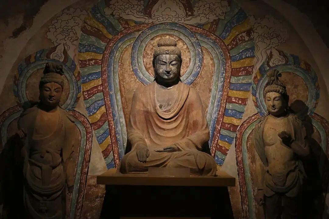 彩塑坐佛与胁侍菩萨 唐代 武威市天梯山石窟 甘肃省博物馆藏