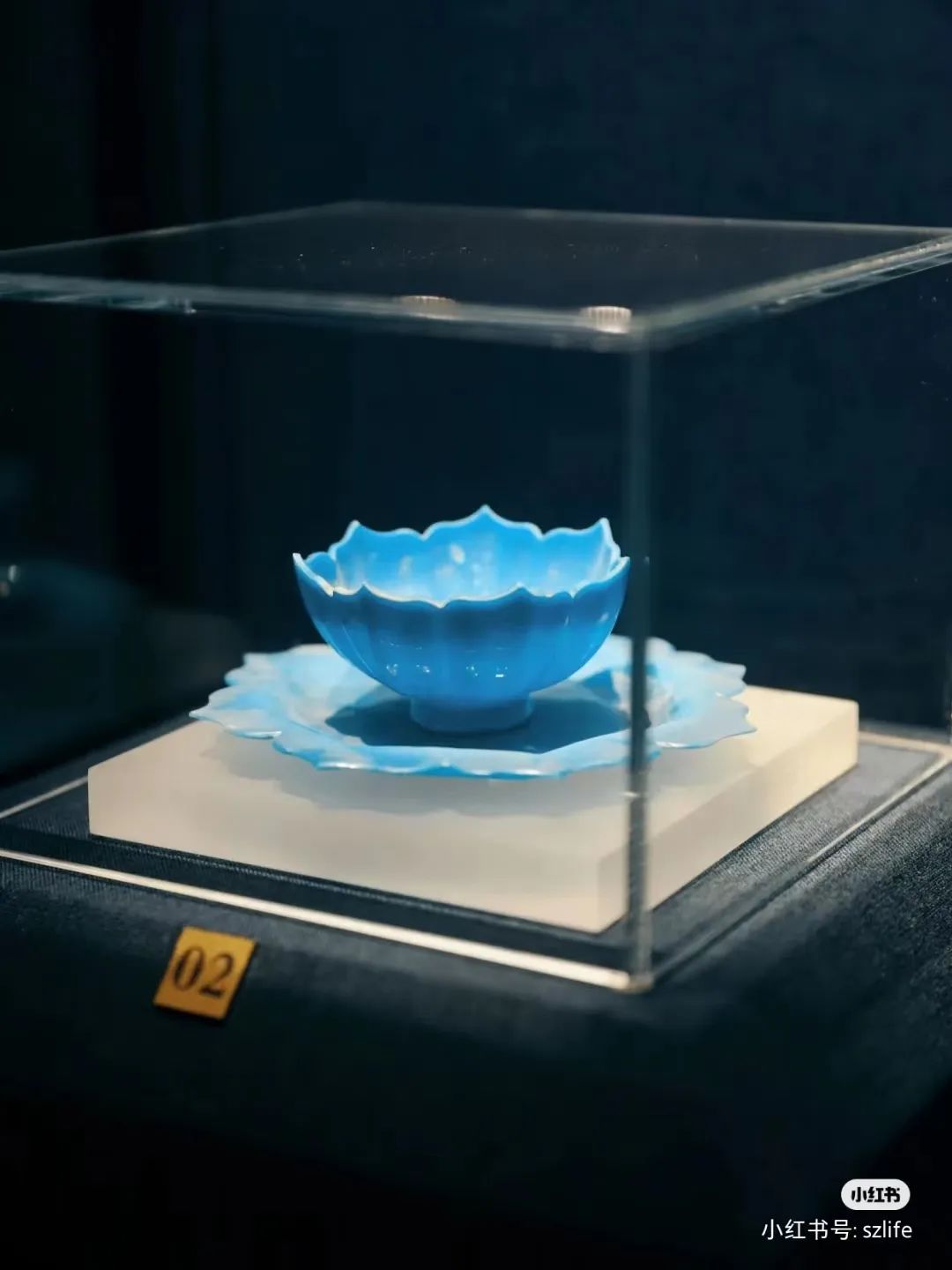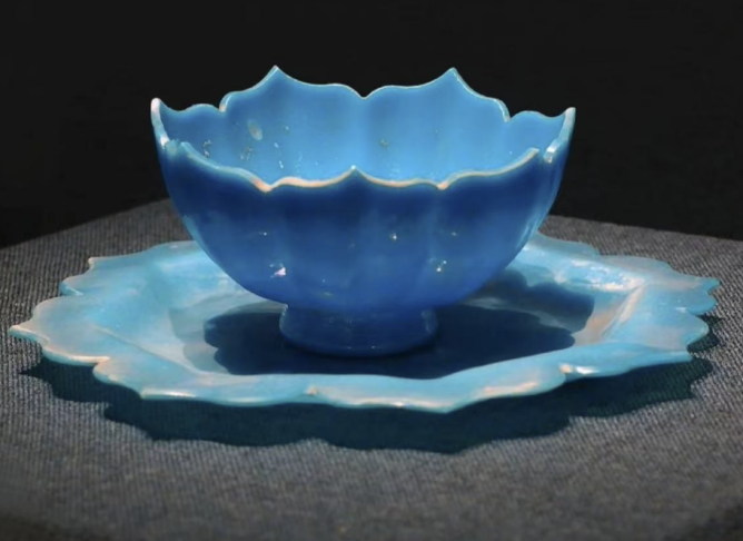 甘肃省博藏莲花形玻璃托盏是迄今为止出土最完整的一套元代玻璃托盏,刚出土时,表面布满泥沙,工作人员暂定为普通二级文物。在博物馆清洗莲花形玻璃托盏时,莲花托盏显露出原本的华丽造型与惊艳成色,经过进一步鉴定,莲花形玻璃托盏被评定为一级文物,成为甘肃省博物馆镇馆之宝。其为普蓝色玻璃制成,半透明,胎内含气泡,颜色温润鲜亮。盏为七瓣莲花形,托口为平口,边沿呈八瓣莲花形,腹壁呈正八角形。托盏造型优美,色彩艳丽,工艺精湛,是中国古代玻璃制品中的稀世珍品。