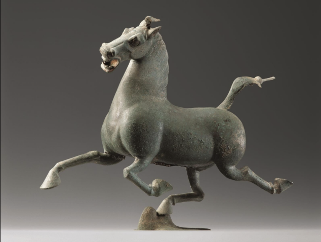 铜奔马出土于武威市雷台汉墓,是甘肃省博物馆镇馆之宝之一,造型矫健精美,腿蹄轻捷,作疾足奔驰状。塑造者摄取了奔马三足腾空、一足超掠飞鹰的刹那瞬间。让飞鹰回首惊顾,更增强奔马急速向前的动势。其全身的着力点集注于超越飞鹰的那一足上,准确地掌握了力学的平衡原理,具有卓越的工艺技术水平,构思巧妙,艺术造型精炼,铸铜工艺卓越。后成为中国特色的旅游标志之一。