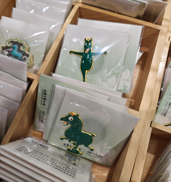 近年来甘肃省博以铜奔马为原型,创作了可爱的“绿马”文创,蠢萌蠢萌的绿色小马具有鲜明的标识,和博物馆中昂首嘶鸣的奔马形成强烈反差,是甘肃省博物馆别具特色的招牌文创产品之一。