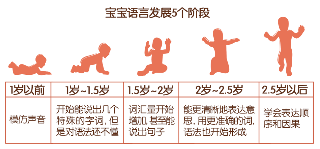 正常情况下的,宝宝的语言发育过程分为以下5个阶段,宝爸宝妈可以对照参考。