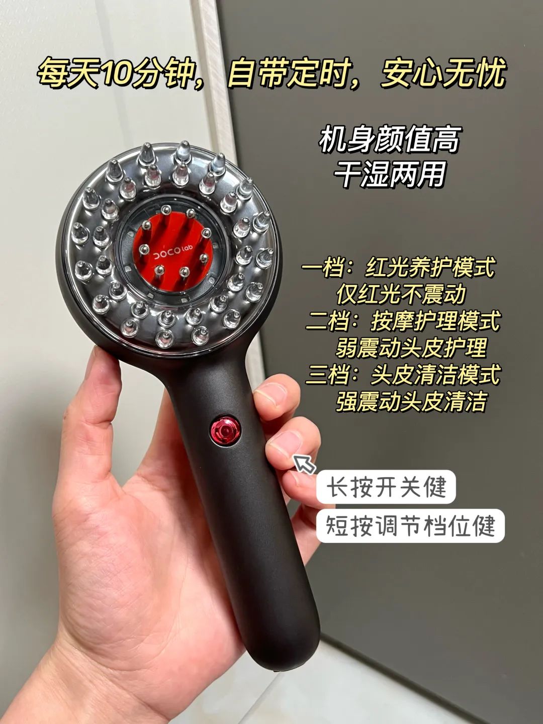 它是龙旗集团&宝洁校友会& 欧莱雅校友会&玛丽黛佳联合投资的(都是手机行业和美妆个护行业的大佬)。他们也做过大排灯等美容仪器,把红光应用到头皮护理上,小菜一碟。和他们对接资料时,也因为他们的专业态度感到非常安心。国内外都取得了各项专利资质认证,有真人测试报告,特证报告(精华液),还有专业的皮肤医生推荐......1台=头皮按摩梳+红光养护+头皮精华给液器+头皮清洁。相当于把一个spa馆装进梳子里了,4大功能,只花一份钱。开团还送有特证的霸王育发精油,这精油单买也要二十多一瓶。说实在的,200多可能只是你去美容院/医院照一两次光的钱。比起植发,200多更算不上啥,买一台回去,咱能用好几年,匀下来每天做头皮护理的钱少到一分一毫。👉想尝试头皮护理,又不想花大价钱,200多能用好几年因为防水,每次用完用水冲洗一下,可以给家里人轮流用(16岁以上可用)。按摩梳整个机身上下只有一个按键,3档模式一键就能切换,非常方便。