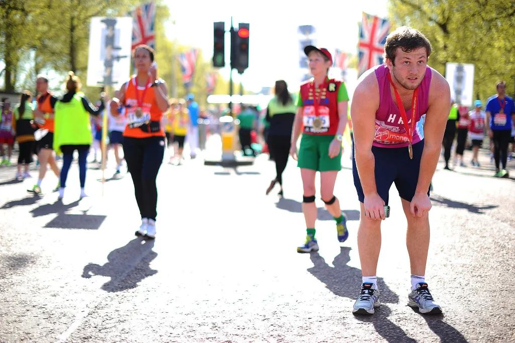 不少跑者在完赛后不自觉地就会用双手撑着膝盖休息。