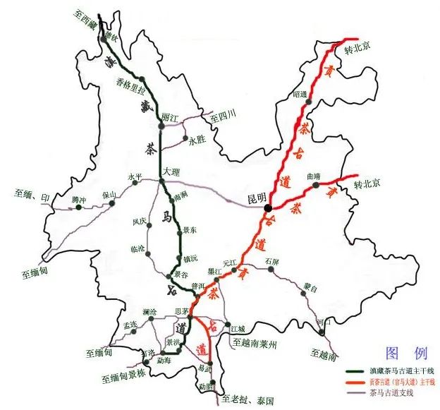 茶马古道共有三条道路。第一条是陕甘茶马古道,是中国内地茶叶西行并换回马匹的主道。第二条是陕康藏茶马古道(蹚古道),始于汉唐,主要是由陕西商人开辟的。陕西商人从西安出发至汉中,一路到达康定及其周围,与藏族同胞进行茶马交易。第三条是滇藏茶马古道,是陕康藏茶马古道的一部分,始于唐代,东起雅安,经打箭炉(今康定),西至西藏拉萨,最后通到不丹、尼泊尔和印度,是古代和西藏必不可少的桥梁和纽带。