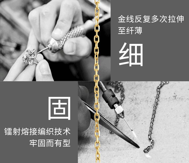 我们的耳环和手链上都有这条O型细链,为了让黄金充分闪耀又保持轻盈优雅的姿态,也是挑战了不同的工艺: