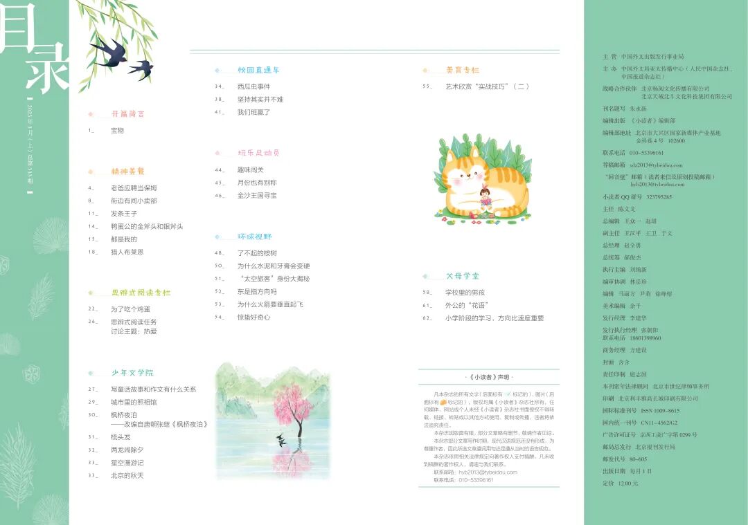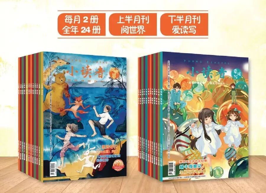 它分为上月刊、下月刊,即《小读者·阅世界》和《小读者·爱读写》。一个月的上旬寄送阅读刊,下旬寄送写作刊。《小读者》杂志全年24期,总字数约150万字,即使以六年级的标准算,也达到了新课标要求课外阅读量的1.4倍。