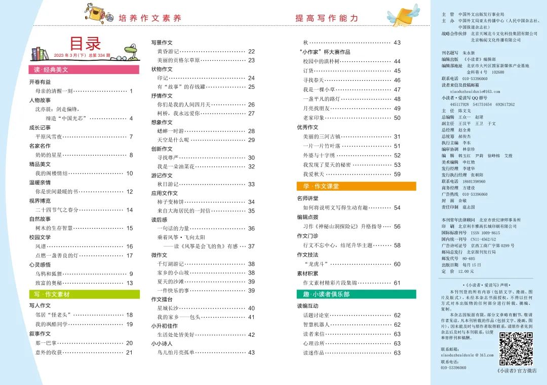 《小读者·爱读写》每期精选60篇左右的作文,有名家的,也有孩子的优秀作文,类型多种多样,文章长短结合,主题各异。