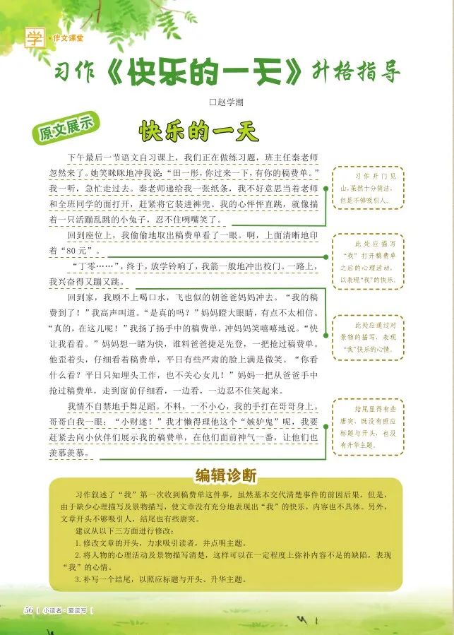 “编辑点拨”栏目,编辑们选择学生投来的稿子,针对具体问题提出修改意见,学生根据意见进行修改,最终使之升格为一篇佳作。好作文原来是可以改出来的!