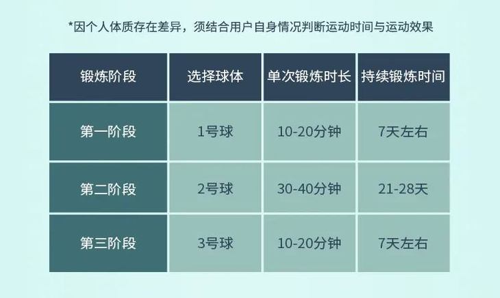 如果是已经V道松弛的朋友,建议从体积最大,重量最轻的1号球开始使用。中等松弛程度的可从2号球进行训练。相对紧致的朋友,可直接从3号球进行联系。