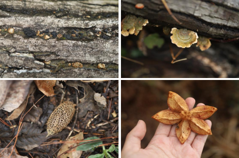 茶树或位于阔叶林下,或自石缝长出,或与茅草与各类爬藤混杂。苔藓,落叶和朽木铺满地面,抓取一把,惊喜地看到里面有健康的白色菌丝,闻了闻,是慢慢发酵以及泥土的味道。我捡到了蛾类用树叶做成的庇护所,以及朽木上长出的小小木耳。同伴采了一把野生的香薷,准备回去做香囊。看到各种各样的苔藓,她说那些苔藓就像是石头上盛放的烟花,在自然里的一刻,人也添了几分灵气。
