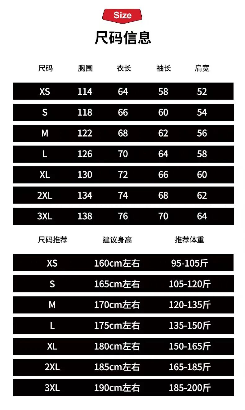 尺码从XS到3XL尺码,适合90-200斤的穿着。