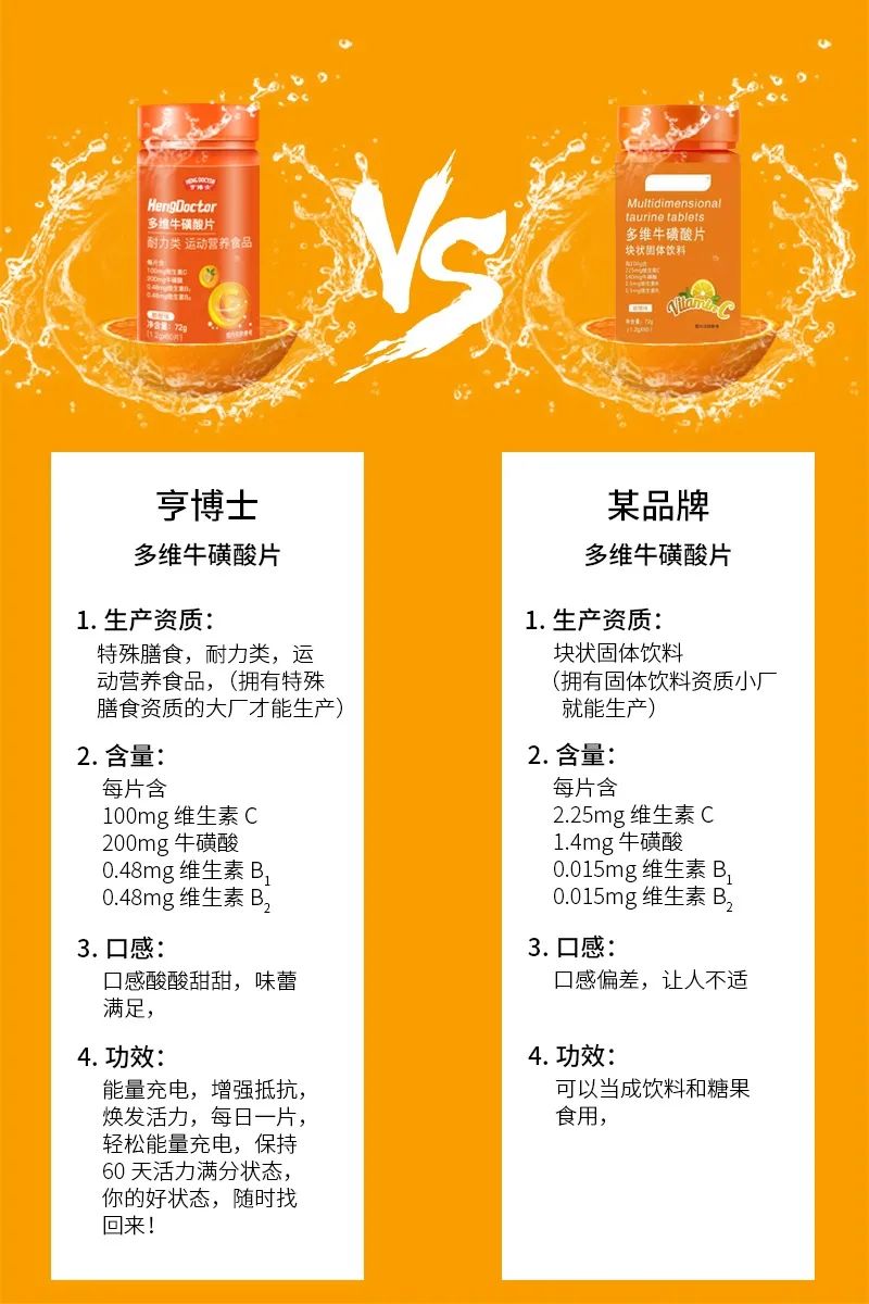 我们来看看亨博士多维牛磺酸片与市面上一般的对比: