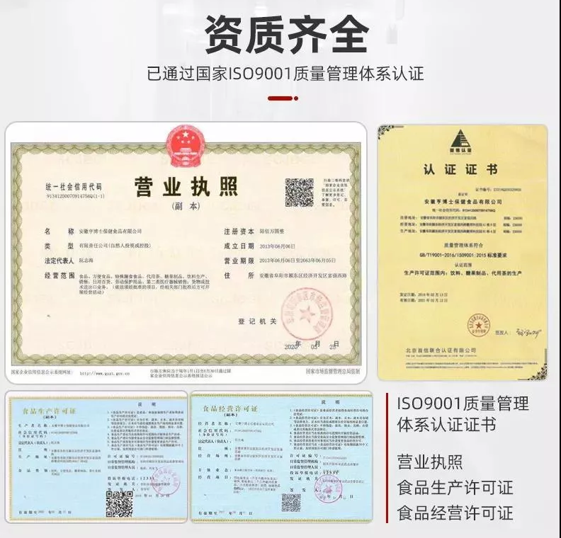 安徽亨博士建厂于2013年,拥有多年食品生产经验,然而,生产多维牛磺酸却不是一般有食品生产资质的小厂就能生产的,必须是拥有特殊膳食资质的大厂才有生产资格,在生产资格上就筛选掉了一批不合格的企业。