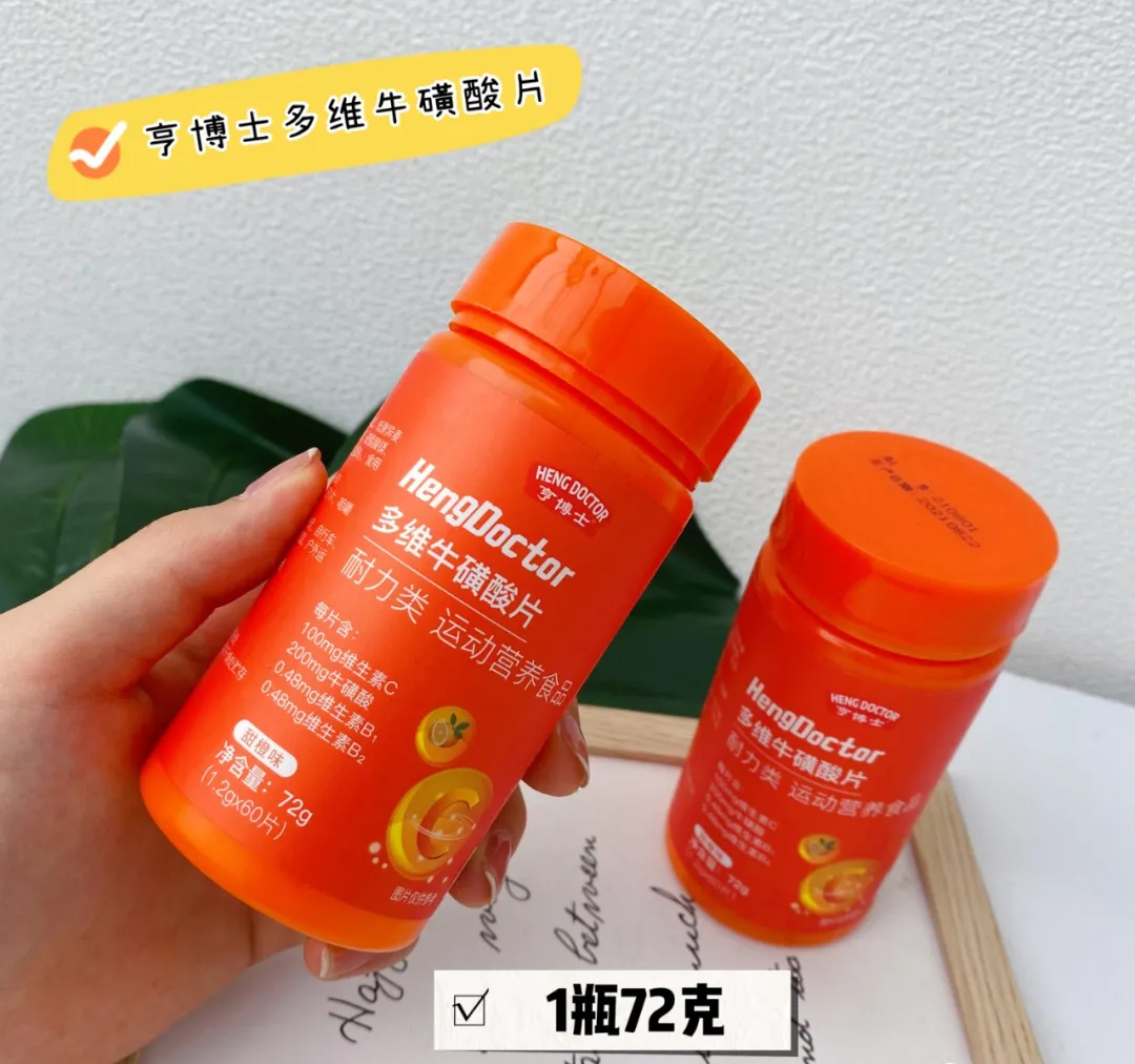 而亨博士多维牛磺酸,含量均以片计,每片含有100mg维生素C,200mg牛磺酸,及0.48毫克的B1及B2,这含量就吊打许多老牌企业。