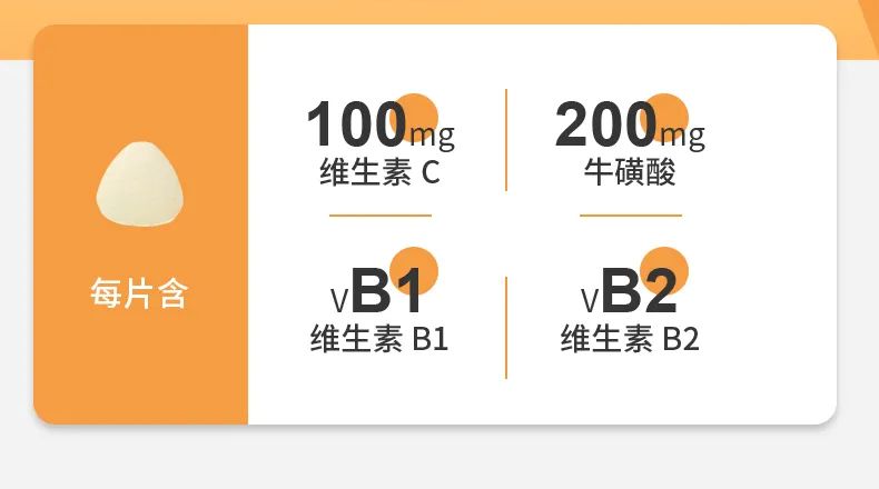 每片内含200mg牛磺酸,100mg维生素C,以及0.48mg的维生素B1、B2,多种成分共同作用,让状态UP,从此摆脱亚健康!!!