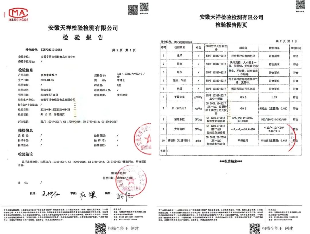经过专业机构检测,亨博士多维牛磺酸片,各项指标符合标准。产品实力过硬,质量安全放心!