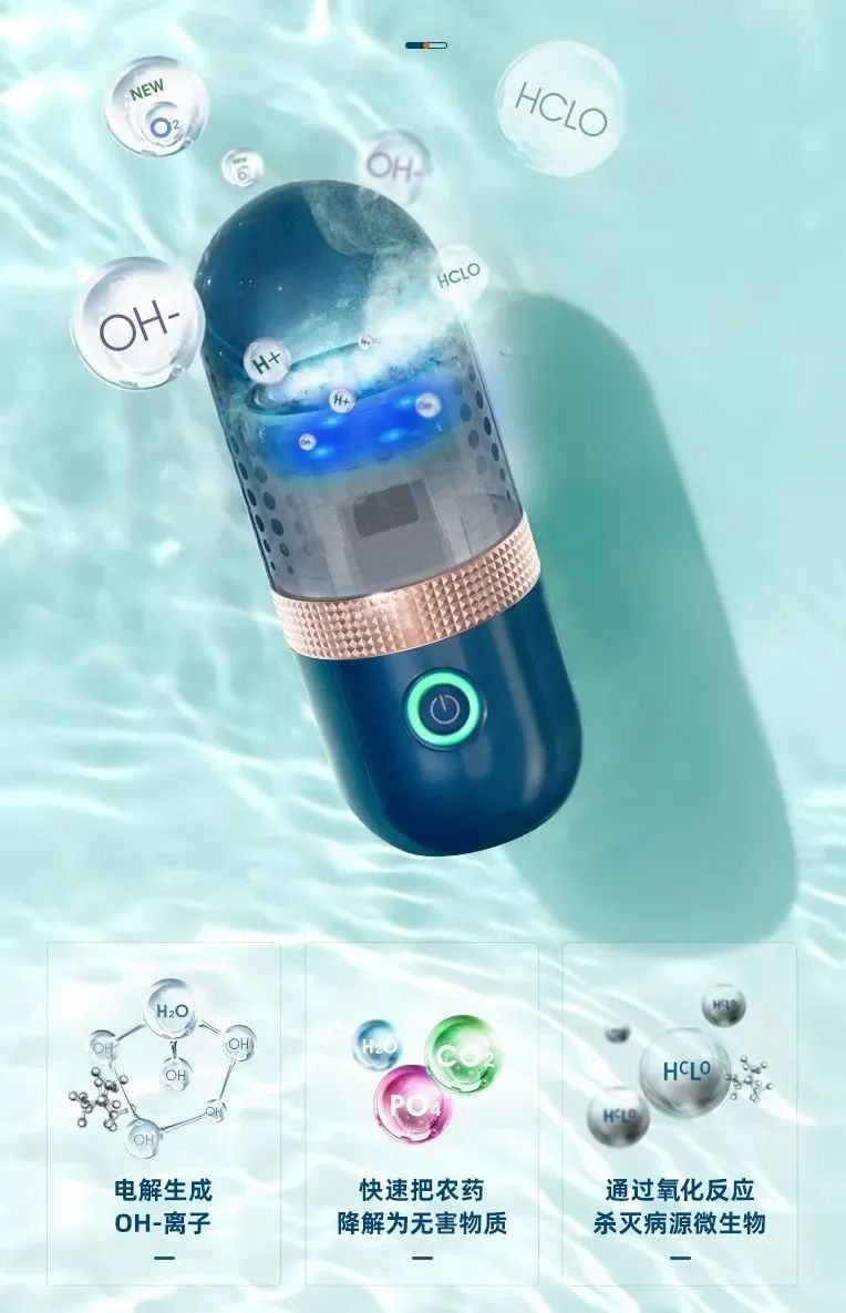 一代胶囊果蔬净化器创新采用了羟基水离子的电解净化技术,可以快速实现洁净,OH-把农残降解成无害物质,氧化反应杀灭病原微生物。整个净化过程没有化学添加,以水为原料,让大家每一口都吃的放心。