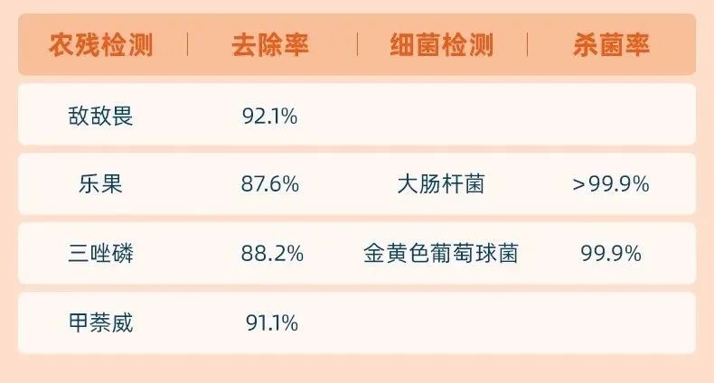 2.满足多类清洗:农药降解效果>90%,杀菌效果>99.9%