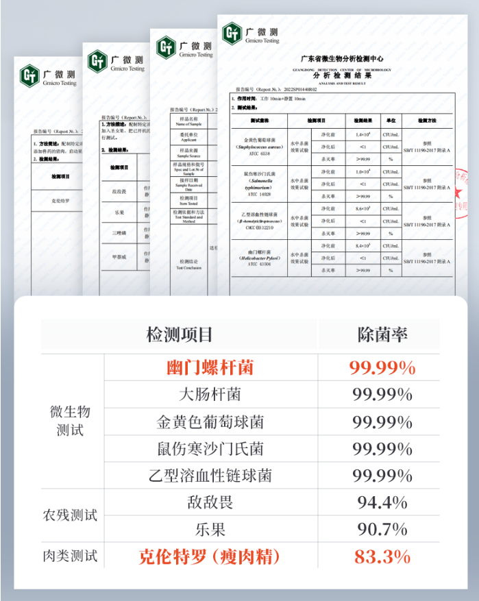 二代分类果蔬净化器相比一代果蔬清洗机,最突出的优点是高效灭菌去农残,除菌率>99.99%,去农残>90%,激素(瘦肉精)去除率>83%;幽门螺杆菌去除率更是高达99.99%。