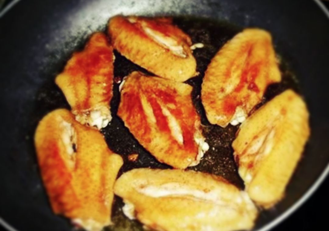 1、热锅凉油,油热后关火,鸡翅入锅煎制(先煎厚皮那面),待其双面煎制金黄时取出;