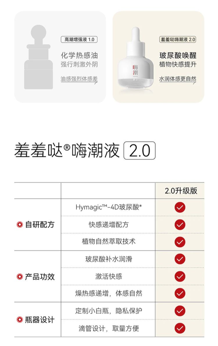 但是这种化学物质对外阴的刺激会比较大,可能会造成一些比较敏感的小伙伴有刺痛的感觉。所以羞羞哒的这款嗨潮液是升级版的快感增强液。