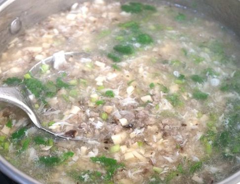 1、锅里放入3斤水,烧开后把准备好的牛肉末,香菇末,芹菜末一起倒入锅里,调适量盐、鸡精、白胡椒粉,倒入调好的水淀粉,改成小火,用手勺把汤搅起来;