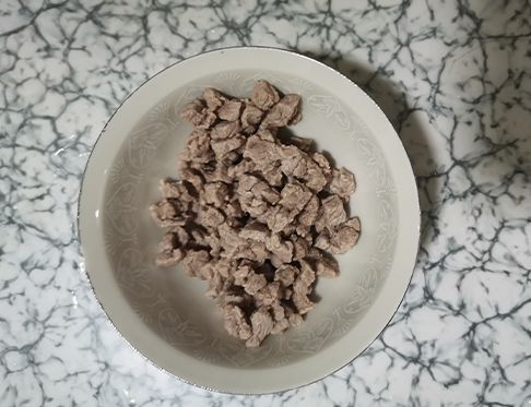 1、牛肉剁碎,放入小碗中,倒入2两水调稀,搅拌均匀,做开一锅水,把牛肉馅倒入锅中,牛肉变白后捞出来,撇清浮沫;