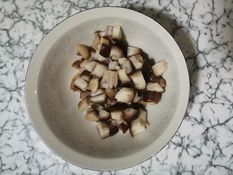 2、香菇清洗干净,根剪掉,放入刚才焯牛肉的锅里,焯水3分钟,然后切成末,和牛肉放在一起;