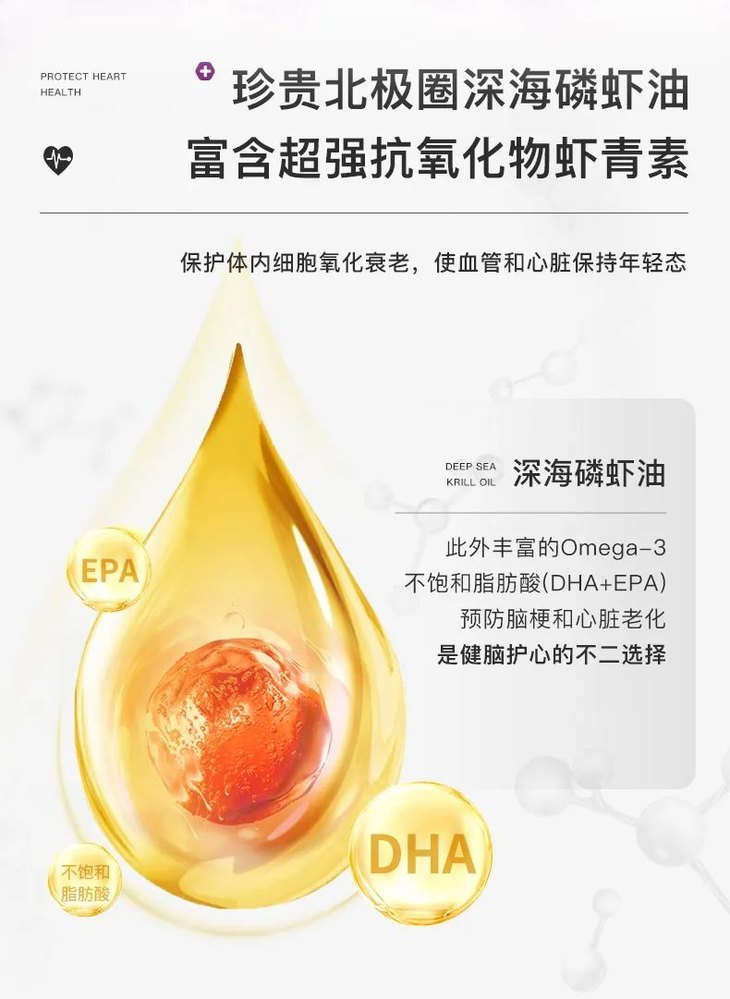 而深海磷虾油中含有丰富的不饱和脂肪酸,可以给身体补充DHA和EPA物质。其中EPA又称“血管清道夫”,能帮助降低胆固醇和甘油三酯的含量,促进体内饱和脂肪酸代谢,从而降低血液粘稠度,增进血液循环。每日摄入足量深海磷虾油,能防止脂肪在血管壁的沉积,维护血管干净通畅,血管健康了,心血管问题自然不会出现。DHA则是俗称的“脑黄金”,有健脑的作用,能帮助修护受损的神经元,建立新的记忆神经突触,降低脑梗风险,维持人体大脑功能。有了磷虾油的加入,可以帮助促进人体循环系统的健康,防止出现堆积胆固醇和脂肪。还可以降低血液中的胆固醇和三酸甘油酯等,预防血栓的形成,对心血管疾病患者有很大的好处。磷虾油内还含有超强抗氧化物虾青素,可以帮助调节体内自由基,保护体内细胞氧化衰老,使血管和心脏保持年轻态。为了保障磷虾油的纯度,诺维肯选择来自北极圈的深海磷虾,又经先进工艺萃取,咀嚼食用也不会有腥味。坚持服用诺维肯护心胶囊,有效调节血脂胆固醇,畅通心血管系统。