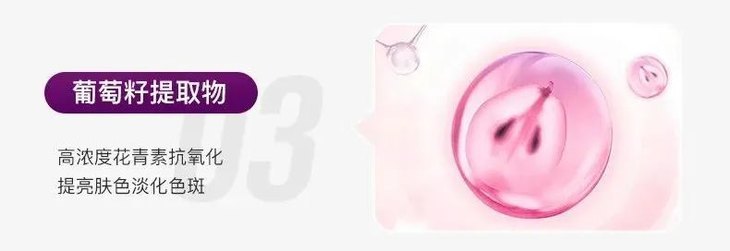 葡萄籽提取物含有高浓度花青素,能够帮助抗氧化,提亮肤色、淡化色斑。