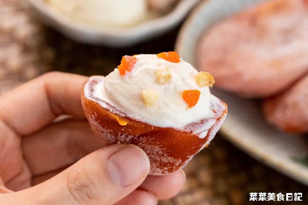 02柿饼冰淇淋 柿饼去蒂,用勺子撑开内心;填满冰淇淋(以芒果/菠萝等酸果味为佳 ),入口沁凉柔腻,满口柿子香甜。