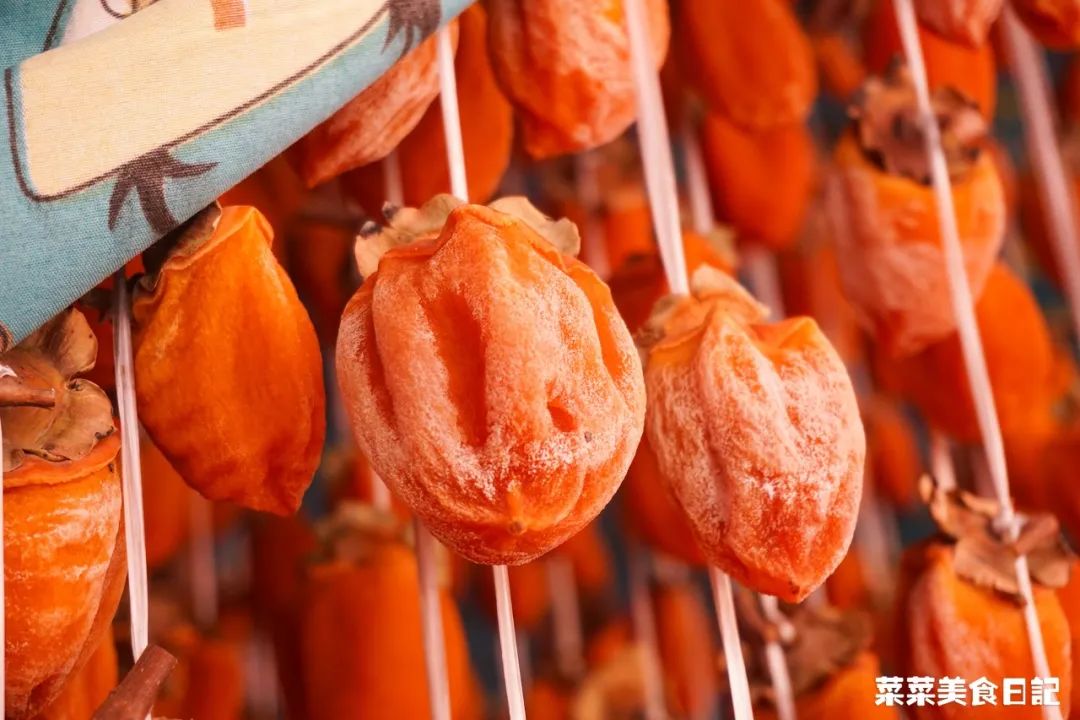 等足60天的柿饼,糖分充分渗出结晶,内部甜度会有所下降,颜色不如45天的鲜亮👇