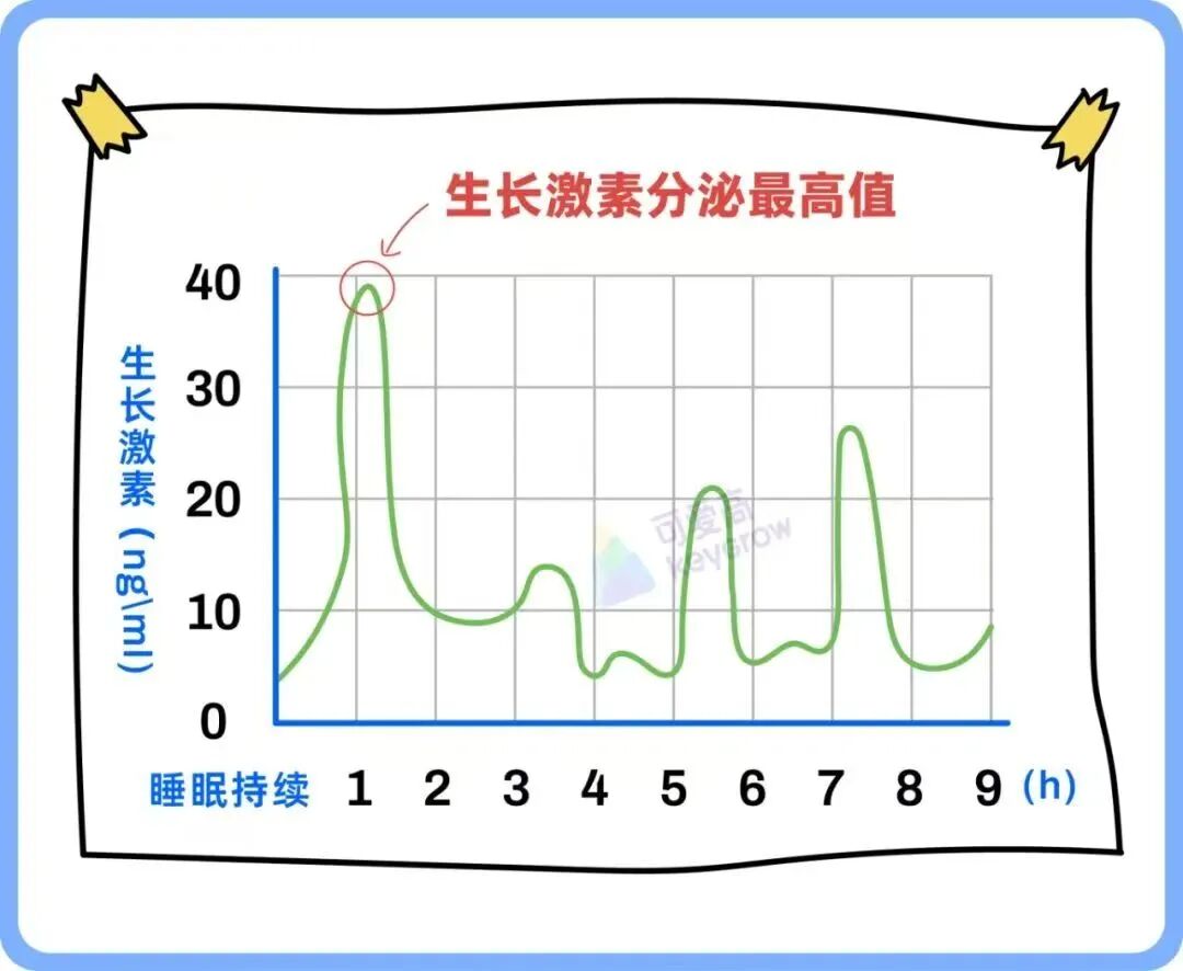 生长激素的分泌也是有规律的,在深度睡眠期间,生长激素分泌增加。白天的时候,生长激素分泌相对较少。孩子入睡后 1 ~2 个小时是生长激素分泌的高峰期,分泌量是白天的 3 倍左右。