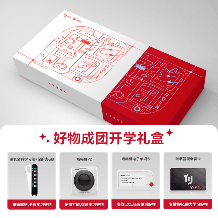 开学季礼盒集合了全科学习、错题打印、英语背单词的强大学习功能,拥有这一整套学习装备,开学动力满满,学习力翻倍!