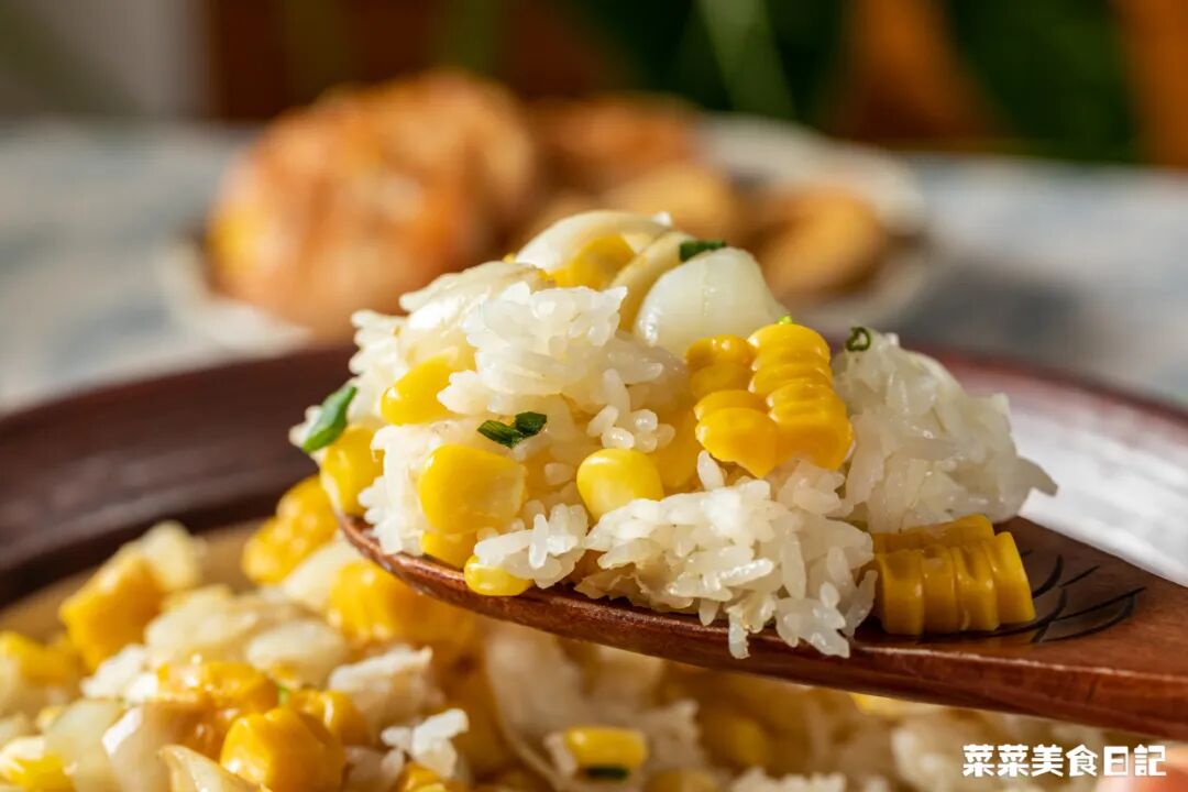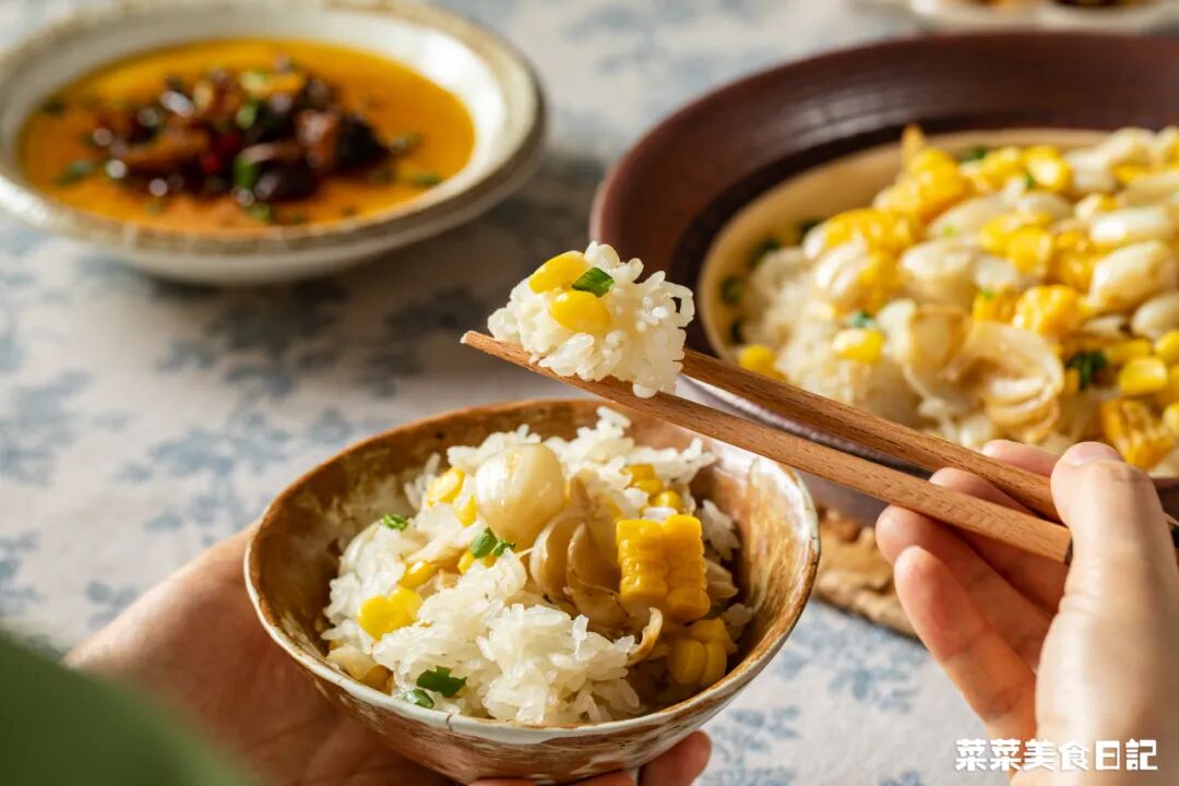 五常大米200g 玉米1根 百合125g 香葱3根 红葱头2颗 生抽1小勺 盐1/4小勺 玉米/花生油3大勺