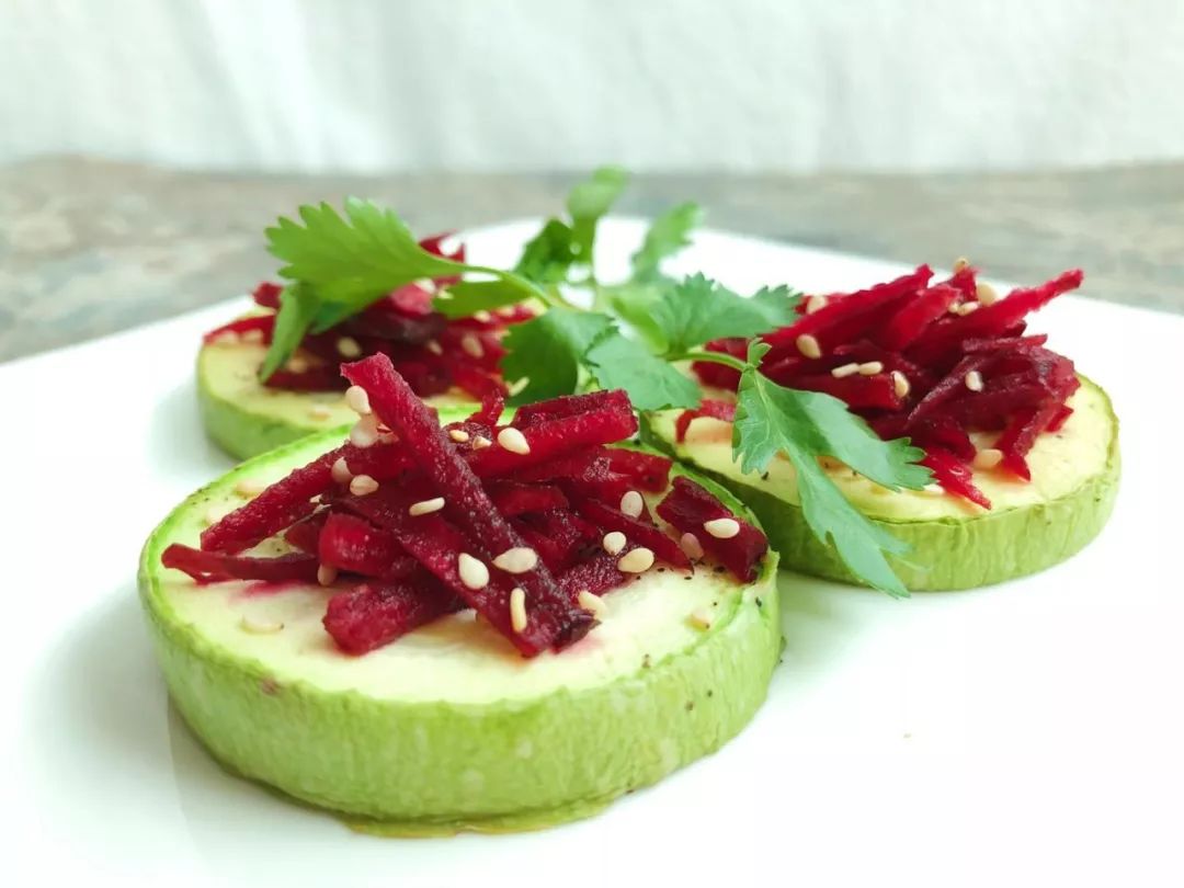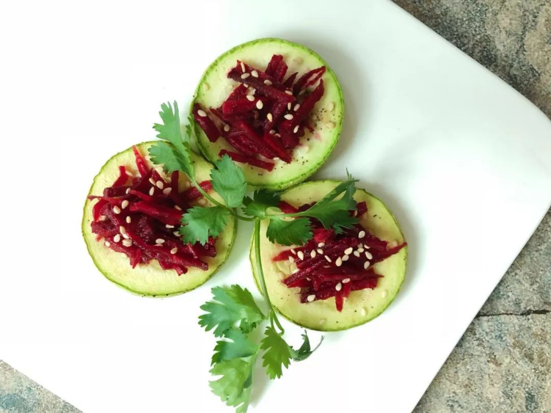 2.甜菜根切丝,放在烤好的西葫芦上面,表面撒白芝麻点缀即可。