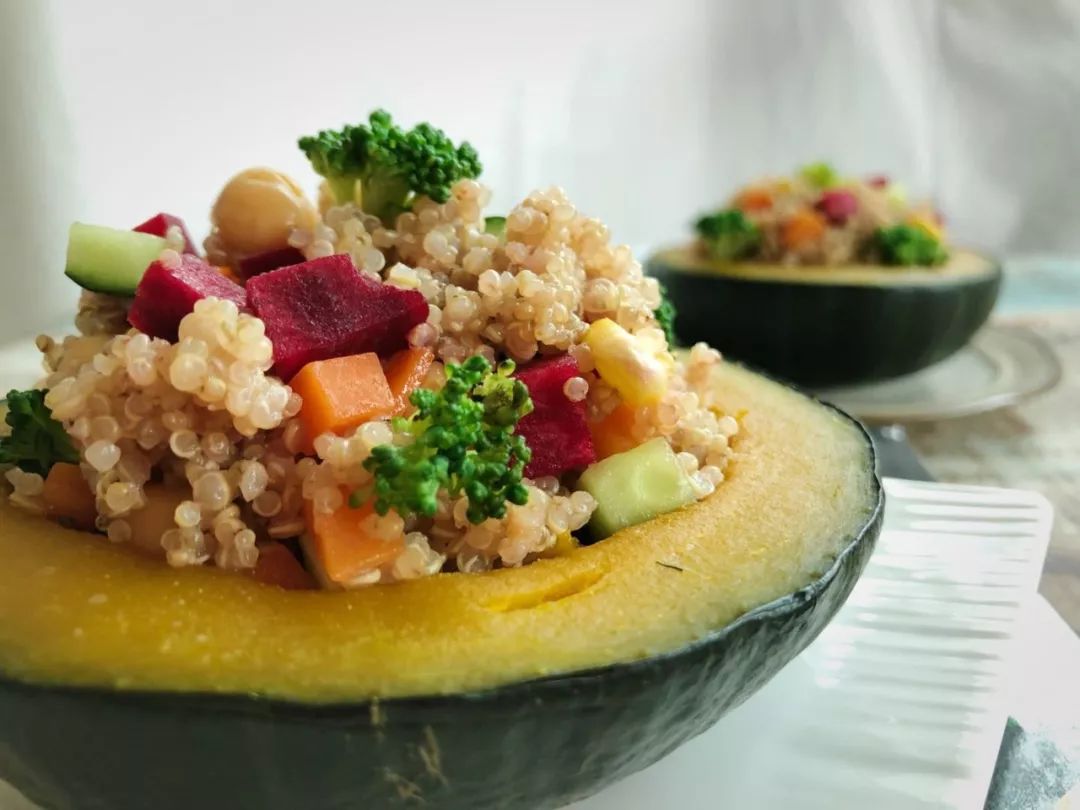 2.把煮熟的藜麦,混合可以生吃的蔬菜和煮熟的豆类(例如:玉米/甜菜根/胡萝卜/鹰嘴豆)拌入少许酱油和柠檬汁,混合均匀,放入南瓜中间,混着南瓜一起食用即可。