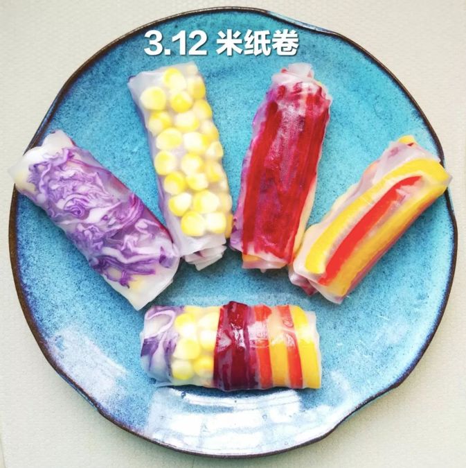 【食材】熟甜玉米粒、红&黄彩椒条、甜菜根丝、紫甘蓝丝、米纸皮