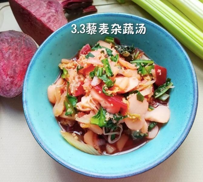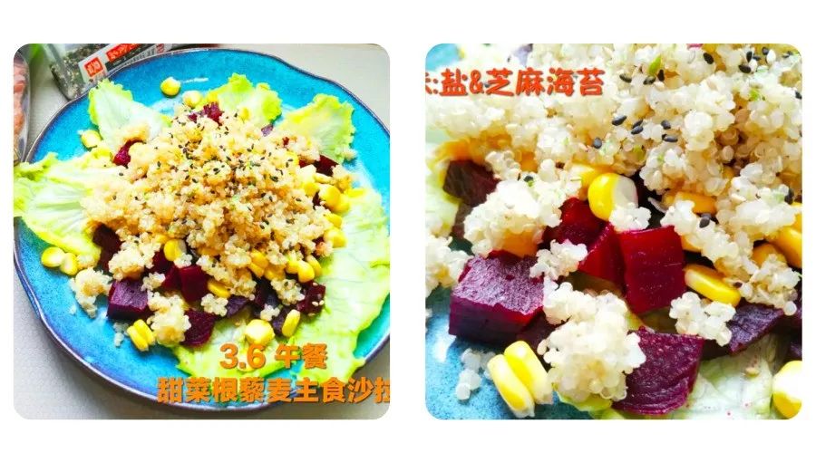 【食材】蒸熟的藜麦饭、煮熟去皮切粒的甜菜根、蒸熟的玉米粒、生菜片