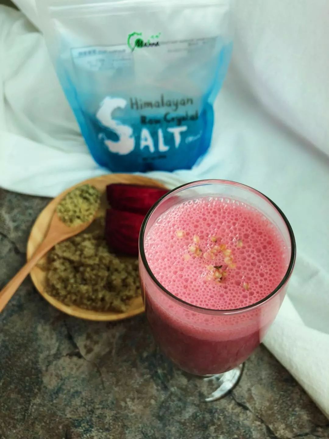 【食材】温水/200g、熟藜麦/70g、甜菜根/30g、火麻仁/10g、海盐/1/4小匙