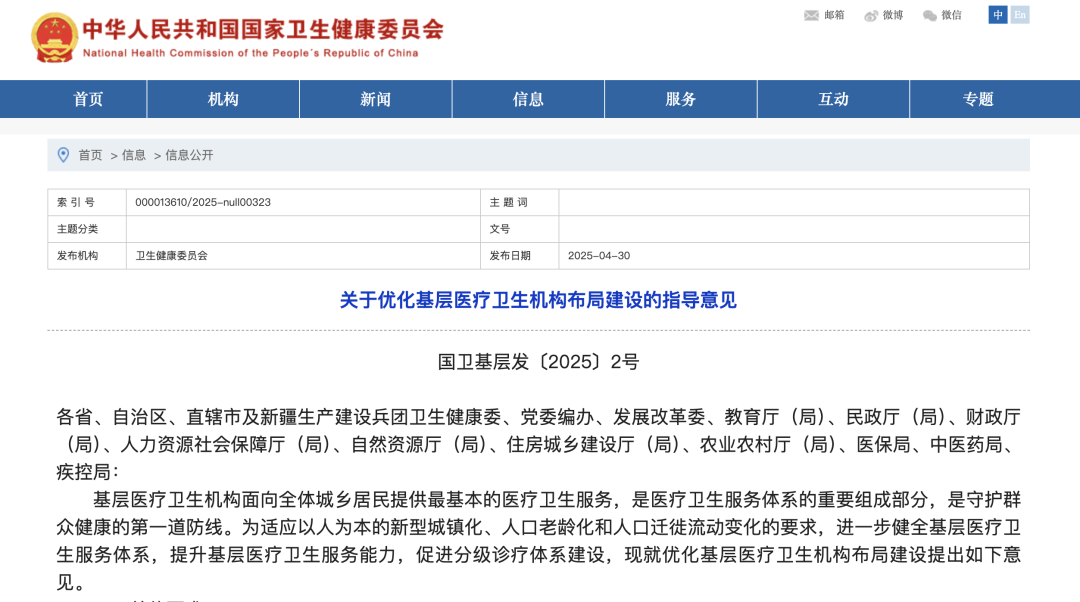 为落实中央文件要求和国务院常务会议部署,实施医疗卫生强基工程和谋划编制“十五五”规划提供依据,指导各地结合实际,把基层医疗卫生机构布局好、建设好、使用好,昨天(4月30日),国家卫生健康委会等十三部门印发了《关于优化基层医疗卫生机构布局建设的指导意见》(以下简称《指导意见》),可以预见的是《指导意见》必将对未来基层医疗机构的设置建设形成深远持久的影响。