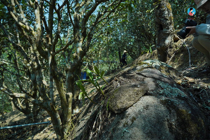 岩石散落茶树旁,石上苔藓泛着黄绿,阳光下生机勃勃。