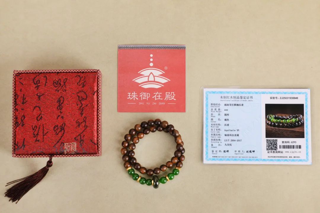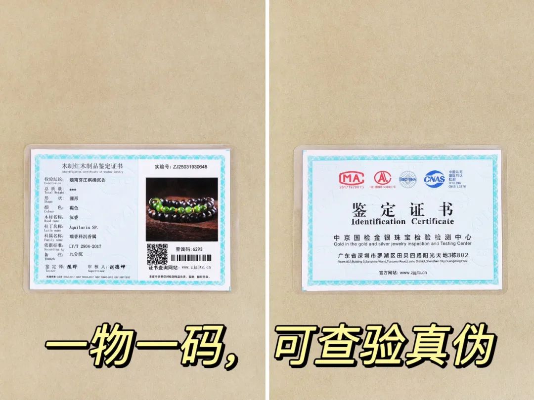 这款手串经过第三方机构的鉴定,带有一份《木制品鉴定证书》,一物一证,一证一码,保证正*品。
