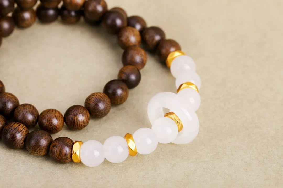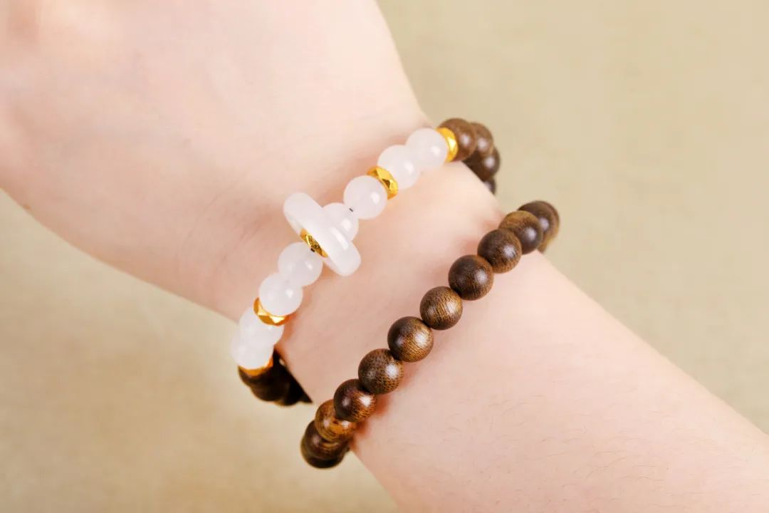 白色玛瑙玉的温润质感与沉香的深沉香气相结合,营造出一种清新脱俗、儒雅温婉的氛围,适合在休闲场合佩戴,展现佩戴者的温柔与贤淑。