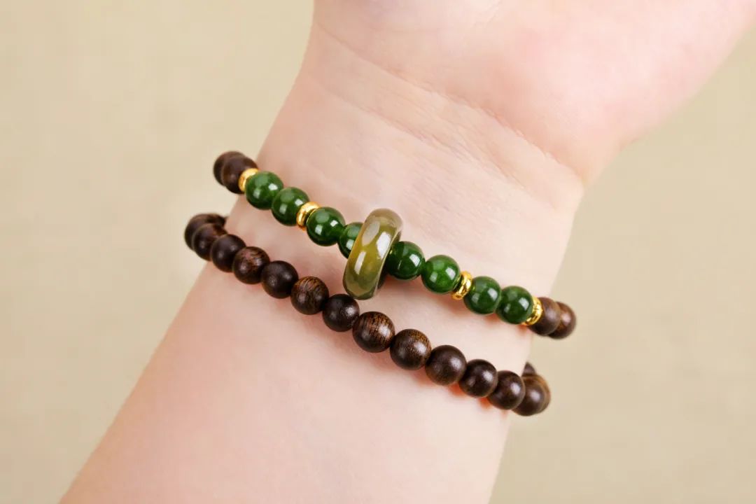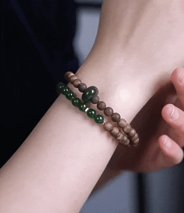 青碧和田玉的温润质感与沉香的深沉香气相结合,营造出一种高雅、内敛的氛围,适合在正式场合佩戴,展现佩戴者的稳重与大气。