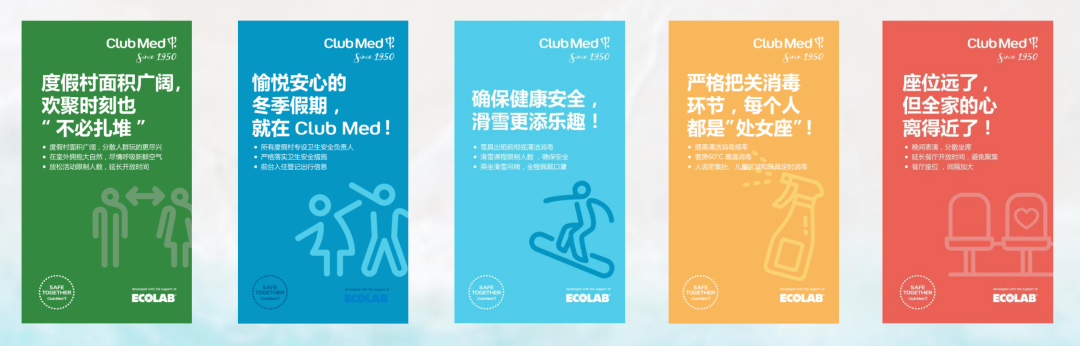 虽然Club Med每天吃吃喝喝活动不少,但度假村在防疫安全方面也是严要求!消毒洗手液在楼道、电梯间随处可见;工作人员处处提醒戴口罩;每日消毒清理雪具…Club Med还特别和全球知名的卫生服务品牌艺康(Ecolab)合作定期审核和提升度假村内的防控措施,度假更安心!