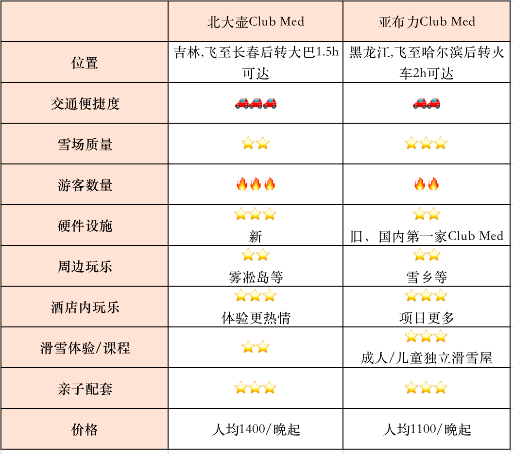 *仅对北大壶&亚布力Club Med之间对比,最高为三星