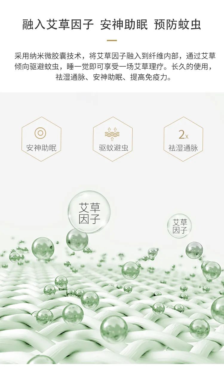 被子纤维是提取天然艾草的精华融入其中,能让蚊虫不近身;另外艾草还有安神助眠的功效;